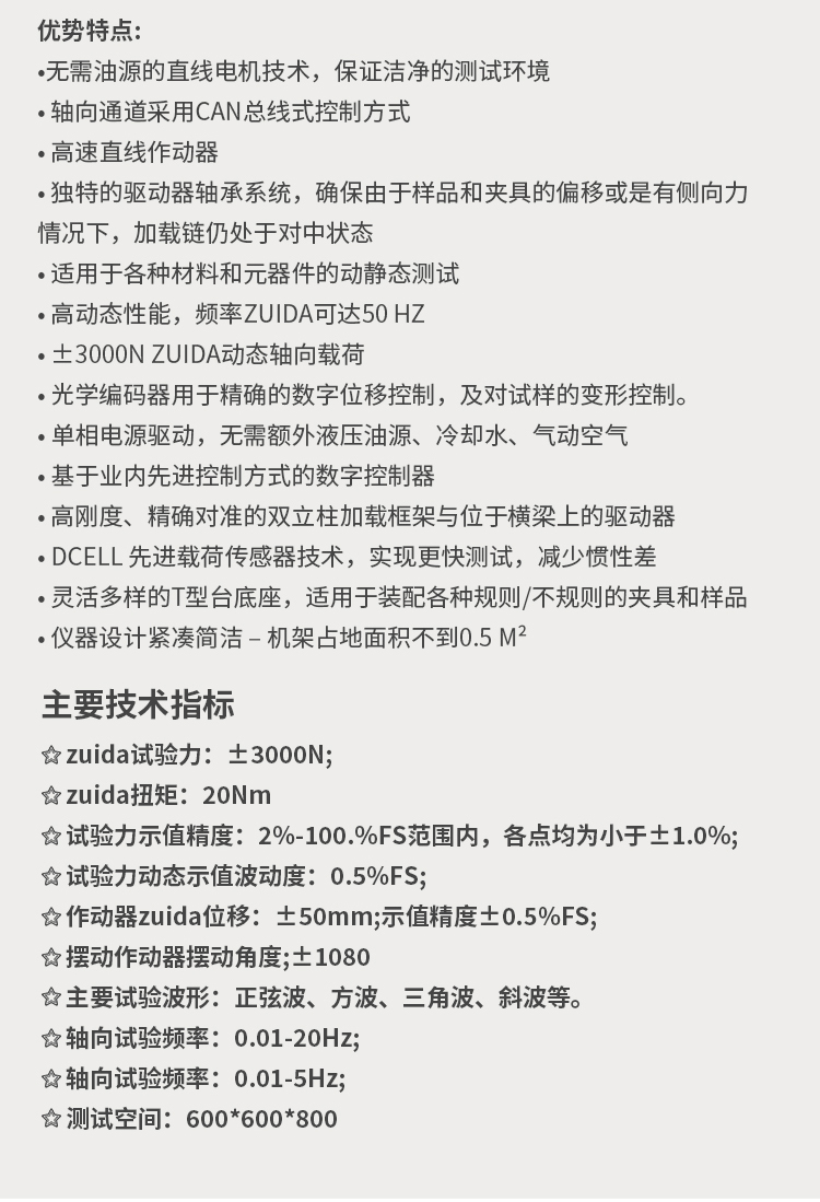 該試驗(yàn)系統(tǒng),既能進(jìn)行動(dòng)態(tài)的高、低周疲勞試驗(yàn)、程序控制疲勞試驗(yàn),也能進(jìn)行靜態(tài)的恒速率、恒應(yīng)變、恒應(yīng)力控制下的試驗(yàn)和各種常規(guī)的力學(xué)性能試驗(yàn),還可進(jìn)行斷裂力學(xué)試驗(yàn),也可以對(duì)廣義范圍上材料或構(gòu)件的疲勞壽命、裂紋擴(kuò)展、斷裂韌性性能測(cè)試、實(shí)際試件的安全性評(píng)價(jià)、工況模擬等,因此有著其它任何種類的試驗(yàn)機(jī)所不能比擬的優(yōu)勢(shì),是國(guó)際疲勞力學(xué)研究領(lǐng)域界最推崇的材料試驗(yàn)設(shè)備。 由于該系統(tǒng)采用自適應(yīng)無(wú)間隙的電動(dòng)伺服作動(dòng)器,頻響速度快,噪音低,節(jié)能環(huán)保,非常適合企業(yè)和研究機(jī)構(gòu)對(duì)小零部件的研究測(cè)試! 2.優(yōu)勢(shì)特點(diǎn): ?無(wú)需油源的直線電機(jī)技術(shù),保證潔凈的測(cè)試環(huán)境 ? 軸向通道采用Can總線式控制方式 ? 高速直線作動(dòng)器 ? 獨(dú)特的驅(qū)動(dòng)器軸承系統(tǒng),確保由于樣品和夾具的偏移或是有側(cè)向力情況下,加載鏈仍處于對(duì)中狀態(tài) ? 適用于各種材料和元器件的動(dòng)靜態(tài)測(cè)試 ? 高動(dòng)態(tài)性能,頻率zuida可達(dá)50 Hz ? ±3000N zuida動(dòng)態(tài)軸向載荷 ? 光學(xué)編碼器用于精確的數(shù)字位移控制,及對(duì)試樣的變形控制。 ? 單相電源驅(qū)動(dòng),無(wú)需額外液壓油源、冷卻水、氣動(dòng)空氣 ? 基于業(yè)內(nèi)先進(jìn)控制方式的數(shù)字控制器 ? 高剛度、精確對(duì)準(zhǔn)的雙立柱加載框架與位于橫梁上的驅(qū)動(dòng)器 ? Dcell 先進(jìn)載荷傳感器技術(shù),實(shí)現(xiàn)更快測(cè)試,減少慣性差 ? 靈活多樣的T型臺(tái)底座,適用于裝配各種規(guī)則/不規(guī)則的夾具和樣品