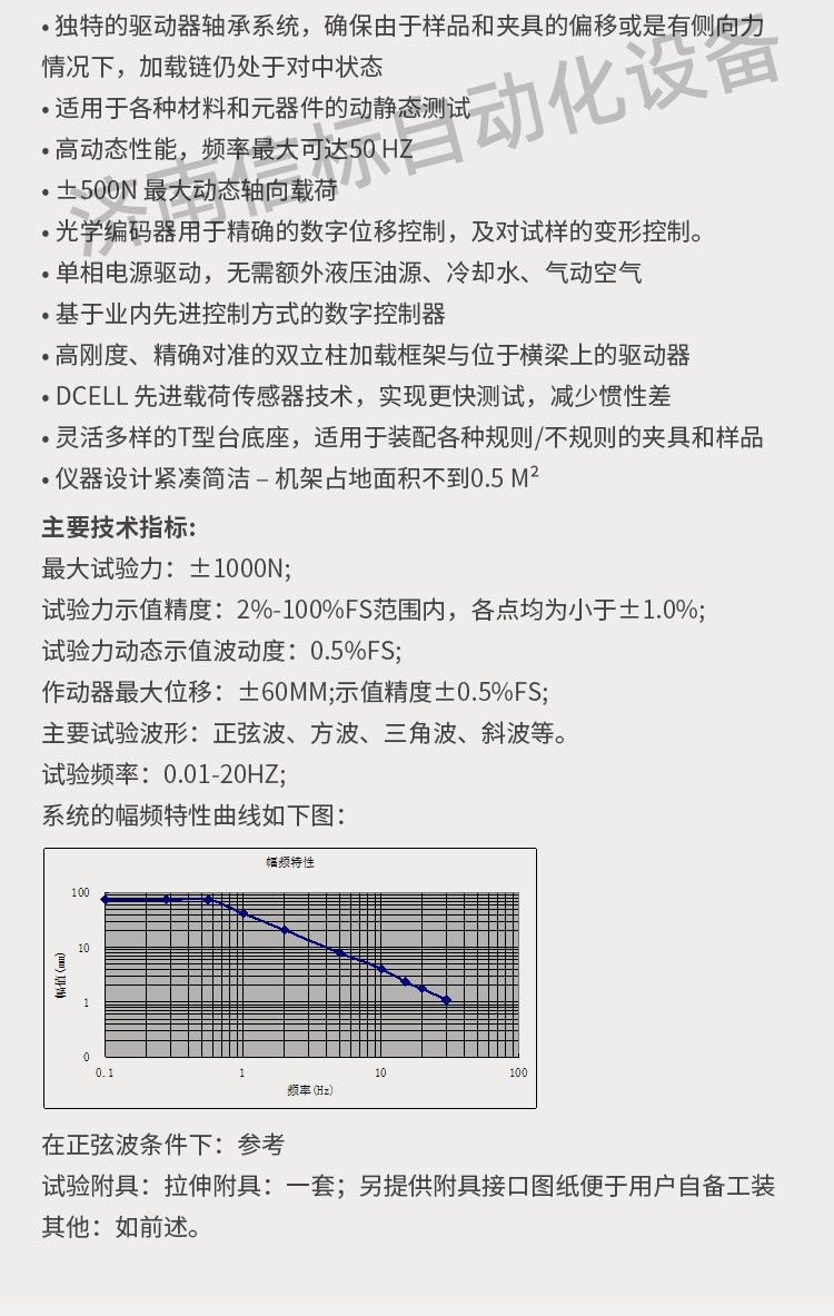 優(yōu)勢特點: ?無需油源的直線電機技術(shù),保證潔凈的測試環(huán)境 ? 軸向通道采用Can總線式控制方式 ? 高速直線作動器 ? 獨特的驅(qū)動器軸承系統(tǒng),確保由于樣品和夾具的偏移或是有側(cè)向力情況下,加載鏈仍處于對中狀態(tài) ? 適用于各種材料和元器件的動靜態(tài)測試 ? 高動態(tài)性能,頻率最大可達(dá)50 Hz ? ±500N 最大動態(tài)軸向載荷 ? 光學(xué)編碼器用于精確的數(shù)字位移控制,及對試樣的變形控制。 ? 單相電源驅(qū)動,無需額外液壓油源、冷卻水、氣動空氣 ? 基于業(yè)內(nèi)先進(jìn)控制方式的數(shù)字控制器 ? 高剛度、精確對準(zhǔn)的雙立柱加載框架與位于橫梁上的驅(qū)動器 ? Dcell 先進(jìn)載荷傳感器技術(shù),實現(xiàn)更快測試,減少慣性差 ? 靈活多樣的T型臺底座,適用于裝配各種規(guī)則/不規(guī)則的夾具和樣品 ? 儀器設(shè)計緊湊簡潔 – 機架占地面積不到0.5 m2 優(yōu)勢特點: ?無需油源的直線電機技術(shù),保證潔凈的測試環(huán)境 ? 軸向通道采用Can總線式控制方式 ? 高速直線作動器 ? 獨特的驅(qū)動器軸承系統(tǒng),確保由于樣品和夾具的偏移或是有側(cè)向力情況下,加載鏈仍處于對中狀態(tài) ? 適用于各種材料和元器件的動靜態(tài)測試 ? 高動態(tài)性能,頻率最大可達(dá)50 Hz ? ±500N 最大動態(tài)軸向載荷 ? 光學(xué)編碼器用于精確的數(shù)字位移控制,及對試樣的變形控制。 ? 單相電源驅(qū)動,無需額外液壓油源、冷卻水、氣動空氣 ? 基于業(yè)內(nèi)先進(jìn)控制方式的數(shù)字控制器 ? 高剛度、精確對準(zhǔn)的雙立柱加載框架與位于橫梁上的驅(qū)動器 ? Dcell 先進(jìn)載荷傳感器技術(shù),實現(xiàn)更快測試,減少慣性差 ? 靈活多樣的T型臺底座,適用于裝配各種規(guī)則/不規(guī)則的夾具和樣品 ? 儀器設(shè)計緊湊簡潔 – 機架占地面積不到0.5 m2