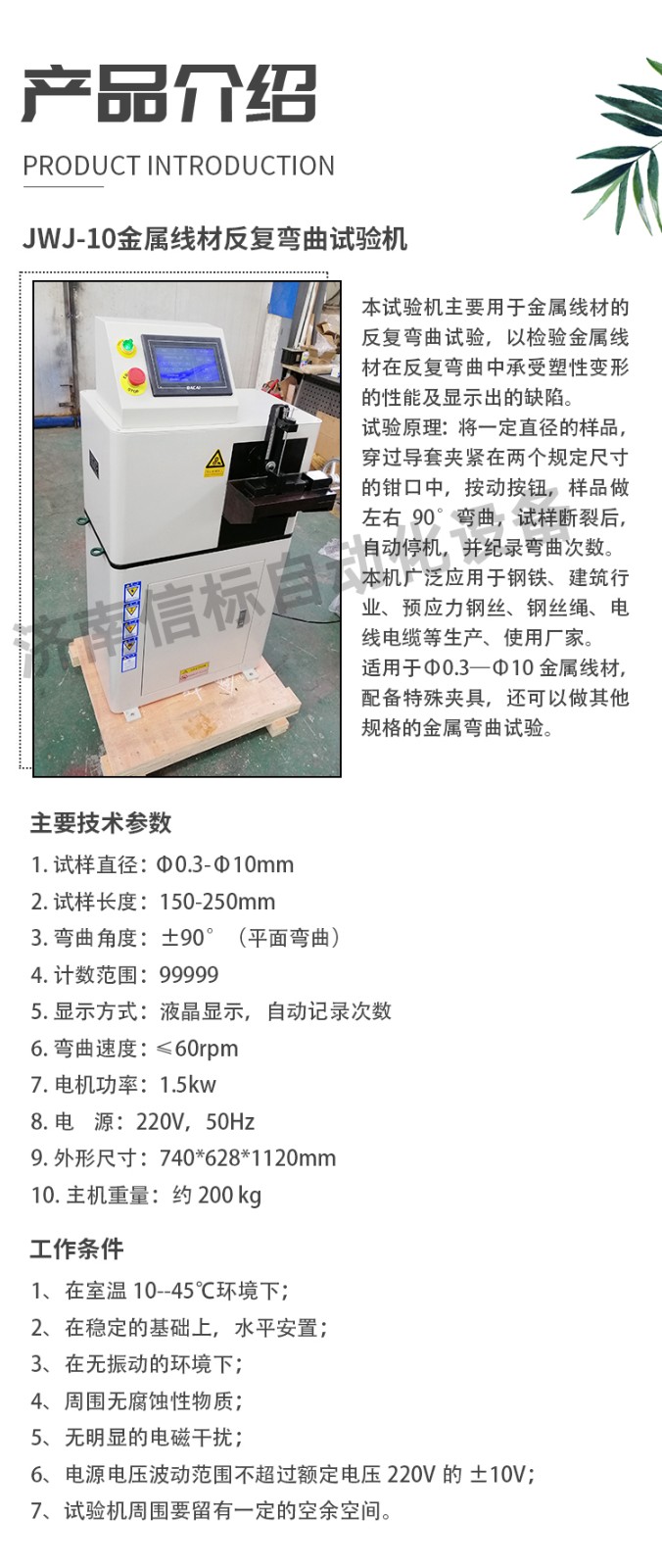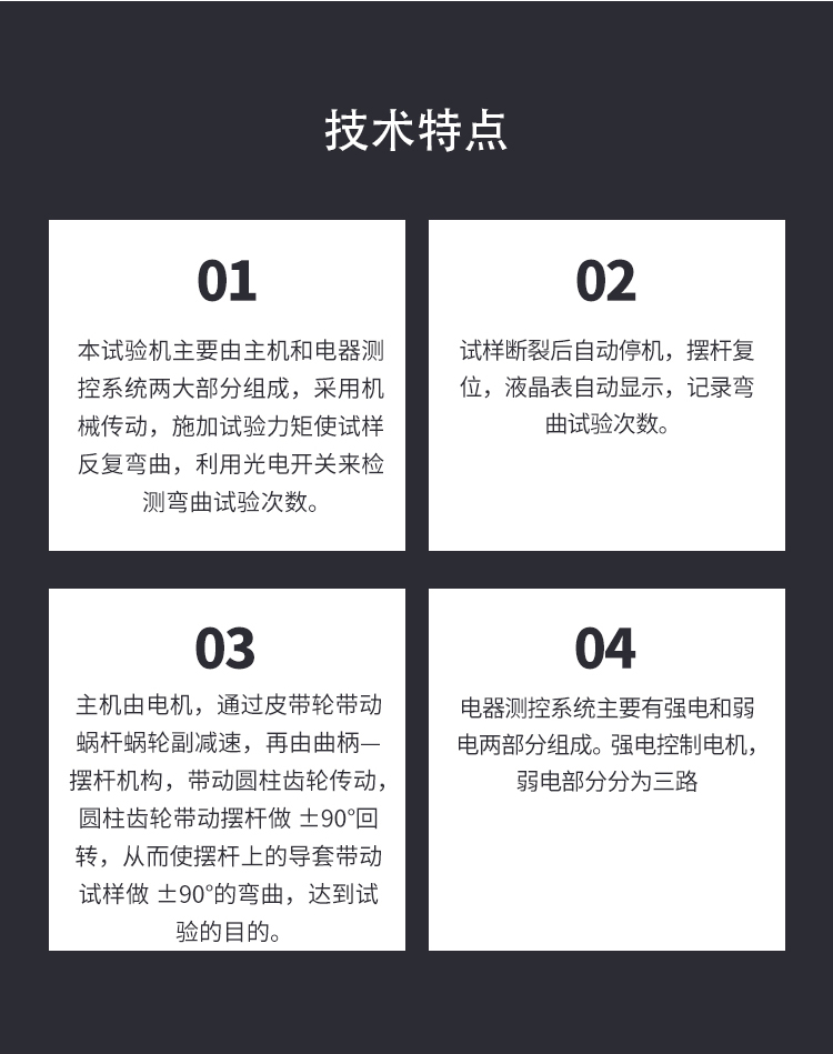 主要技術(shù)參數(shù) 1.試樣直徑:Φ0.3-Φ10mm 2.試樣長(zhǎng)度:150-250mm 3.彎曲角度:±90°(平面彎曲) 4.計(jì)數(shù)范圍:99999 5.顯示方式:液晶顯示,自動(dòng)記錄次數(shù) 6.彎曲速度:≤60rpm 7.電機(jī)功率:1.5kw 8.電 源:220V,50Hz 9.外形尺寸:740*628*1120mm 10.主機(jī)重量:約200 kg 結(jié)構(gòu)特征與工作原理 本試驗(yàn)機(jī)主要由主機(jī)和電器測(cè)控系統(tǒng)兩大部分組成,采用機(jī)械傳動(dòng),施加試驗(yàn)力矩使試樣反復(fù)彎曲,利用光電開(kāi)關(guān)來(lái)檢測(cè)彎曲試驗(yàn)次數(shù)。試樣斷裂后自動(dòng)停機(jī),擺桿復(fù)位,液晶表自動(dòng)顯示,記錄彎曲試驗(yàn)次數(shù)。 主機(jī) 主機(jī)由電機(jī),通過(guò)皮帶輪帶動(dòng)蝸桿蝸輪副減速,再由曲柄—擺桿機(jī)構(gòu),帶動(dòng)圓柱齒輪傳動(dòng),圓柱齒輪帶動(dòng)擺桿做±90°回轉(zhuǎn),從而使擺桿上的導(dǎo)套帶動(dòng)試樣做±90°的彎曲,達(dá)到試驗(yàn)的目的。在圓柱齒輪上裝有記數(shù)用的裝置,試樣每彎曲一次,光電開(kāi)關(guān)采集一次信號(hào),這樣就達(dá)到了記數(shù)的目的。 試驗(yàn)結(jié)束后,如果擺桿沒(méi)有停到中間位置,按復(fù)位鍵,則由另一只光電開(kāi)關(guān)采集信號(hào),使擺桿恢復(fù)到中間位置。 在擺桿上,裝有撥桿,而撥桿上裝有內(nèi)徑大小不同的導(dǎo)套,針對(duì)不同粗細(xì)的試樣,把撥桿調(diào)整到不同的高度,并使用不同的導(dǎo)套。將導(dǎo)套放入撥桿孔內(nèi),用扭簧將其別住,并使其與撥桿導(dǎo)通。 在擺桿的下方,裝有試樣夾持裝置。手動(dòng)旋轉(zhuǎn)絲杠,使活動(dòng)鉗口平移,將試樣夾緊。對(duì)不同直徑的試樣,更換相應(yīng)的鉗口和導(dǎo)套(鉗口和導(dǎo)套上有標(biāo)記)。