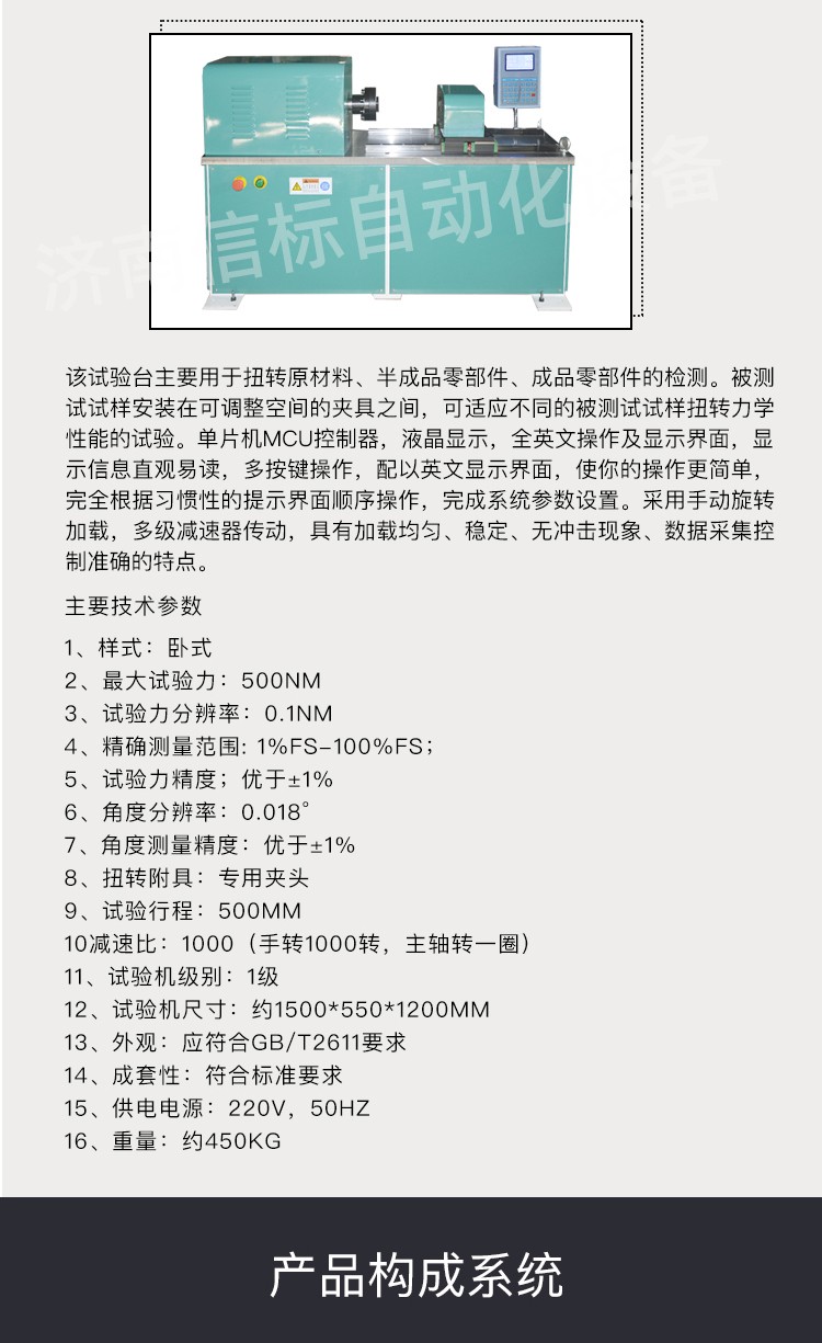 1、可以實(shí)現(xiàn)合格性試驗(yàn):判定扭矩扭角間的對應(yīng)關(guān)系,觀察試驗(yàn)是否變形、或是破壞 2、可以實(shí)現(xiàn)破壞性試驗(yàn):扭斷試驗(yàn),扭至試樣斷裂,求取峰值 三、產(chǎn)品構(gòu)成系統(tǒng): 1 試驗(yàn)主機(jī):采用臥式結(jié)構(gòu),高精度導(dǎo)軌+滑塊,剛性好,精度高。 2 傳動(dòng)系統(tǒng):由手動(dòng)旋轉(zhuǎn)輪,多級減速機(jī)等組成。 3 測力系統(tǒng):由高精度扭矩傳感器、美國AD芯片等組成。 4 顯示系統(tǒng):試驗(yàn)力測量系統(tǒng)由高精度負(fù)荷傳感器、測量放大器、A/D轉(zhuǎn)換、穩(wěn)壓電源等組成;角度測量控制系統(tǒng)由光電編碼器、倍頻整形電路、計(jì)數(shù)電路等組成。通過各種信號(hào)處理,實(shí)現(xiàn)液晶顯示、及數(shù)據(jù)處理等功能。 5 安全保護(hù)裝置:滿量程過載時(shí)控制器有聲音報(bào)警。