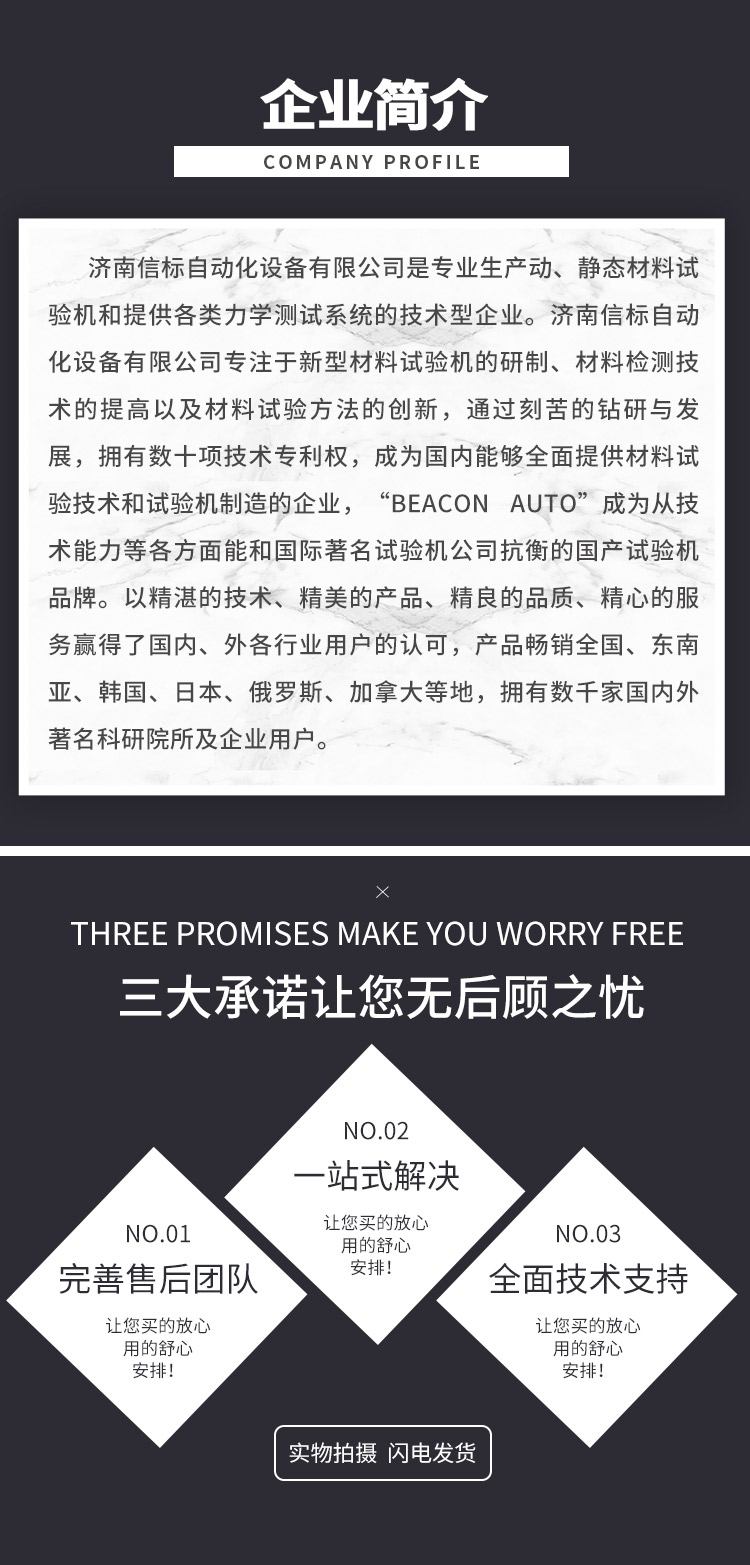 濟(jì)南信標(biāo)自動化設(shè)備有限公司主要生產(chǎn):動靜態(tài)萬能疲勞試驗(yàn)機(jī),接骨板彎曲試驗(yàn)機(jī),縫合線拉伸疲勞試驗(yàn)機(jī),髖膝關(guān)節(jié)磨損試驗(yàn)機(jī),電子萬能試驗(yàn)機(jī)、液壓萬能試驗(yàn)機(jī)、巖石三軸、四軸,電液拉力試驗(yàn)機(jī),材料試驗(yàn)機(jī),高低溫蠕變,高低頻疲勞,拉伸、扭轉(zhuǎn)、杯突等二十多個(gè)系列兩千多個(gè)的品種。