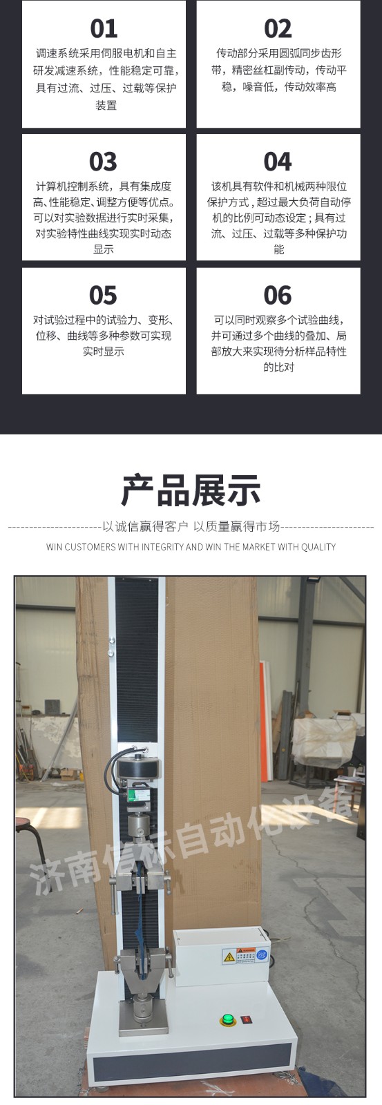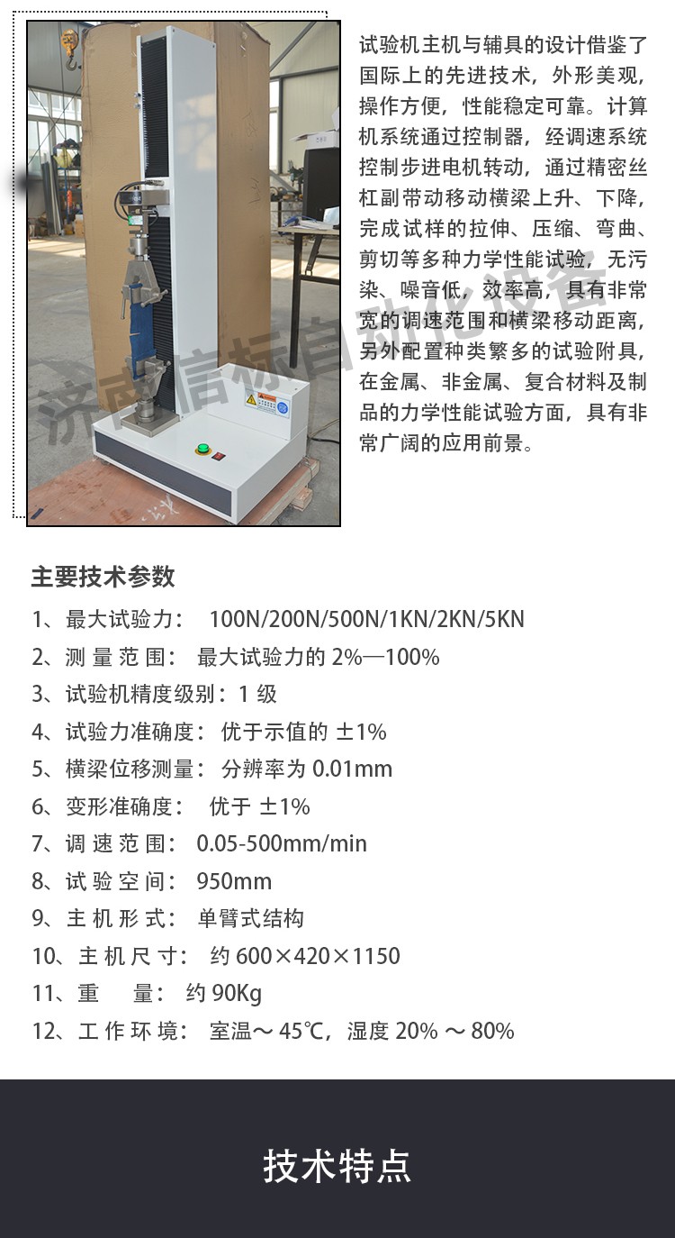 主要功能及特點: 1、主機: 1.1調(diào)速系統(tǒng)采用伺服電機和自主研發(fā)減速系統(tǒng),性能穩(wěn)定可靠,具有過流、過壓、過載等保護裝置。調(diào)速范圍可達0.05~500mm/min。 1.2傳動部分采用圓弧同步齒形帶,精密絲杠副傳動,傳動平穩(wěn),噪音低,傳動效率高。 1.3萬向節(jié)采用十字插銷結(jié)構(gòu),而且具有擺角限制功能,一方面便于試樣夾持,保證試驗同心度,另一方面很好的消除了不規(guī)則試樣對傳感器的影響。 2、控制系統(tǒng)、操作軟件及數(shù)據(jù)處理系統(tǒng) 2.1計算機控制系統(tǒng),具有集成度高、性能穩(wěn)定、調(diào)整方便等優(yōu)點??梢詫嶒灁?shù)據(jù)進行實時采集,對實驗特性曲線實現(xiàn)實時動態(tài)顯示,試驗數(shù)據(jù)文件能以Access常用數(shù)據(jù)庫或SQLserve大型數(shù)據(jù)庫的方式保存,方便實現(xiàn)客戶的資源共享及網(wǎng)絡(luò)管理,以及用戶的再分析。對于用戶自定義的各種word2000報表,該軟件可輕松實現(xiàn)訪問,解決了不同用戶或同一用戶在不同時期對試驗報表有不同需要的難題。該軟件可處理試驗力、位移、 時間、變形的原始數(shù)據(jù)及由此派生的曲線。 2.2保護功能:該機具有軟件和機械兩種限位保護方式,超過最大負荷自動停機的比例可動態(tài)設(shè)定;具有過流、過壓、過載等多種保護功能。 2.3對于負荷、變形通道可實現(xiàn)自動標示,直觀方便。 2.4批量試驗可實現(xiàn)曲線的分層次顯示,曲線自動跟隨。 2.5該軟件可實現(xiàn)用戶自定義的速度設(shè)定,速度的計算機調(diào)整。還可實現(xiàn)高精度的速度標定,隨時調(diào)整速度檔位和編碼。