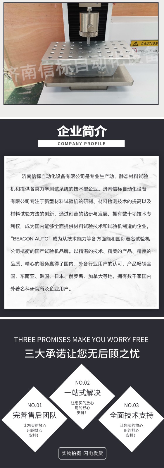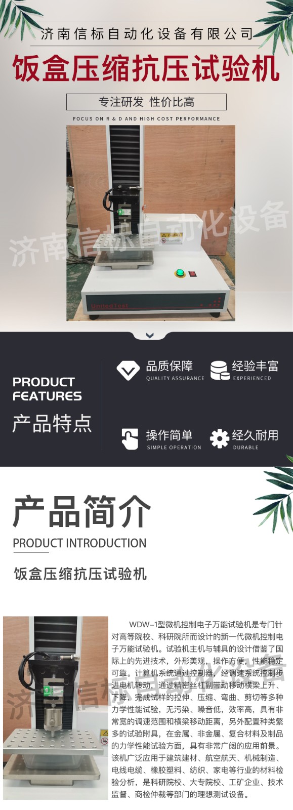 飯盒壓縮抗壓試驗機 單臂壓力萬能試驗機主要技術指標: 1、 最大試驗力: 100N/200N/500N/1KN/2KN/5KN 2、 測 量 范 圍: 最大試驗力的2%—100% 3、 試驗機精度級別:1級 4、 試驗力準確度: 優(yōu)于示值的±1% 5、 橫梁位移測量: 分辨率為0.01mm 6、 變形準確度: 優(yōu)于±1% 7、 調(diào) 速 范 圍: 0.05-500mm/min 8、 試 驗 空 間: 950mm 9、 主 機 形 式: 單臂式結(jié)構(gòu) 10、 主 機 尺 寸: 約600×420×1150 11、 重 量: 約90Kg 12、 工 作 環(huán) 境: 室溫~45℃,濕度20%~80% 飯盒壓縮抗壓試驗機 單臂壓力萬能試驗機主要功能及特點: 主機: 1.1調(diào)速系統(tǒng)采用伺服電機和自主研發(fā)減速系統(tǒng),性能穩(wěn)定可靠,具有過流、過壓、過載等保護裝置。調(diào)速范圍可達0.05~500mm/min。 1.2傳動部分采用圓弧同步齒形帶,精密絲杠副傳動,傳動平穩(wěn),噪音低,傳動效率高。 1.3萬向節(jié)采用十字插銷結(jié)構(gòu),而且具有擺角限制功能,一方面便于試樣夾持,保證試驗同心度,另一方面很好的消除了不規(guī)則試樣對傳感器的影響。 2、控制系統(tǒng)、操作軟件及數(shù)據(jù)處理系統(tǒng) 2.1計算機控制系統(tǒng),具有集成度高、性能穩(wěn)定、調(diào)整方便等優(yōu)點??梢詫嶒灁?shù)據(jù)進行實時采集,對實驗特性曲線實現(xiàn)實時動態(tài)顯示,試驗數(shù)據(jù)文件能以Access常用數(shù)據(jù)庫或SQLserve大型數(shù)據(jù)庫的方式保存,方便實現(xiàn)客戶的資源共享及網(wǎng)絡管理,以及用戶的再分析。對于用戶自定義的各種word2000報表,該軟件可輕松實現(xiàn)訪問,解決了不同用戶或同一用戶在不同時期對試驗報表有不同需要的難題。該軟件可處理試驗力、位移、 時間、變形的原始數(shù)據(jù)及由此派生的曲線。