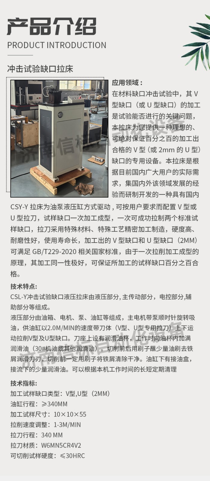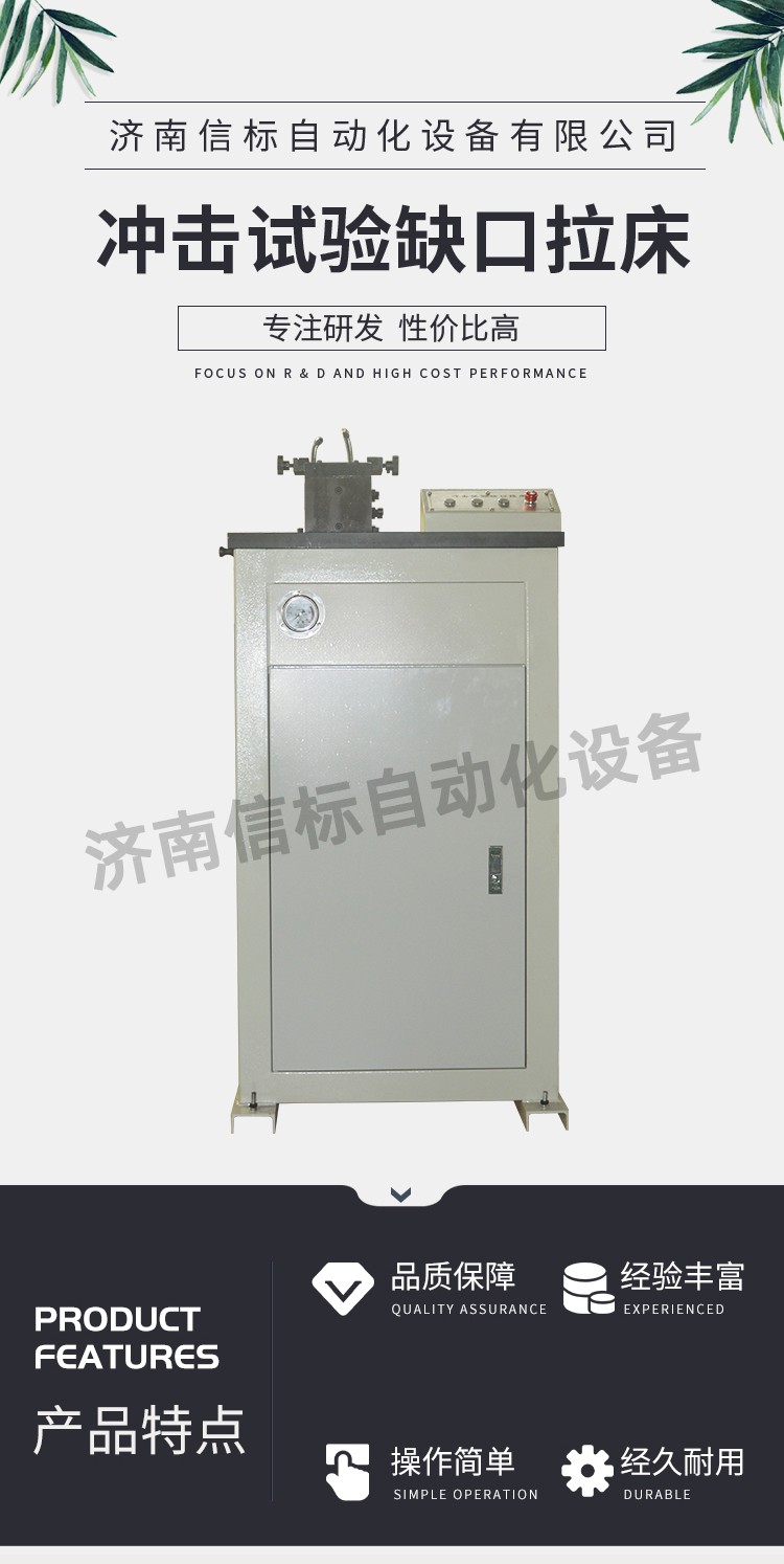 CSY-Y拉床為油泵液壓缸方式驅(qū)動(dòng),可按用戶要求而配置V 型或U 型拉刀,試樣缺口一次加工成型,一次可成功拉制兩個(gè)標(biāo)準(zhǔn)試樣缺口,拉刀采用特殊材料、特殊工藝精密加工制造,硬度高、耐磨性好,使用壽命長(zhǎng),加工出的V 型缺口和U 型缺口(2mm)可滿足GB/T229-2020相關(guān)國(guó)家標(biāo)準(zhǔn),由于一次拉削加工成型的原理,其加工同一性極好,可保證所加工的試樣缺口百分之百合格。 三、技術(shù)特點(diǎn): CSL-Y沖擊試驗(yàn)缺口液壓拉床由液壓部分, 主傳動(dòng)部分,電控部分,輔助部分等組成。 液壓部分由油箱、電機(jī)、泵、油缸等組成,主電機(jī)帶泵順時(shí)針旋轉(zhuǎn)吸油,供油缸以2.0m/min的速度帶刀體(V型、U型專用拉刀)上下運(yùn)動(dòng)拉削V型及U型缺口。刀座上設(shè)有潤(rùn)滑油杯,工作時(shí)向油杯內(nèi)加滿潤(rùn)滑油(30#機(jī)油或其他潤(rùn)滑油)。切削前后用刷子蘸少量油刷去鐵屑潤(rùn)滑刀刃,切削前一定用刷子將鐵屑清除干凈。油缸下有接油盒,接流下的少量潤(rùn)滑油。可以根據(jù)本機(jī)工作時(shí)間的長(zhǎng)短定期清理 四、技術(shù)指標(biāo): 加工試樣缺口類型:V型,U型(2mm) 油缸行程:≥340mm 加工試樣尺寸:10×10×55 拉削速度調(diào)整:1-3m/min 拉刀行程:340 mm 拉刀材質(zhì):W6Mn5Cr4V2 可切削試樣硬度:≤30HRC 五、設(shè)備配置: 缺口自動(dòng)拉床主機(jī) 1臺(tái) 拉刀及導(dǎo)向裝置 1套 試樣固定裝置 2套 油缸及連接部件 1套 潤(rùn)滑噴淋系統(tǒng) 1套 10MPa油源動(dòng)力系統(tǒng) 1套 電氣及控制系統(tǒng) 1套 防護(hù)系統(tǒng)(帶開門斷電) 1套 產(chǎn)品合格證 1套 產(chǎn)品使用說明書 1套 產(chǎn)品使用說明書 1套 液壓系統(tǒng)配件 1套