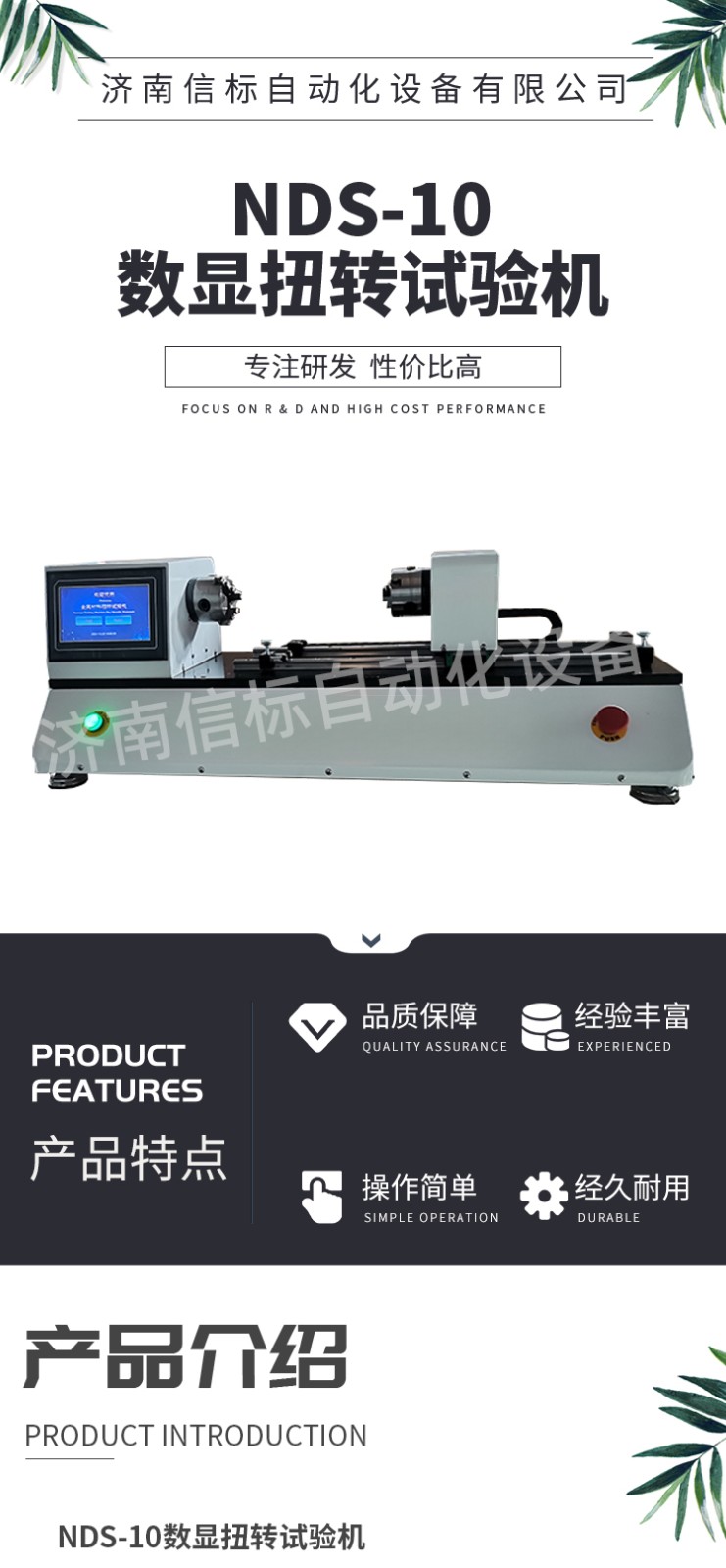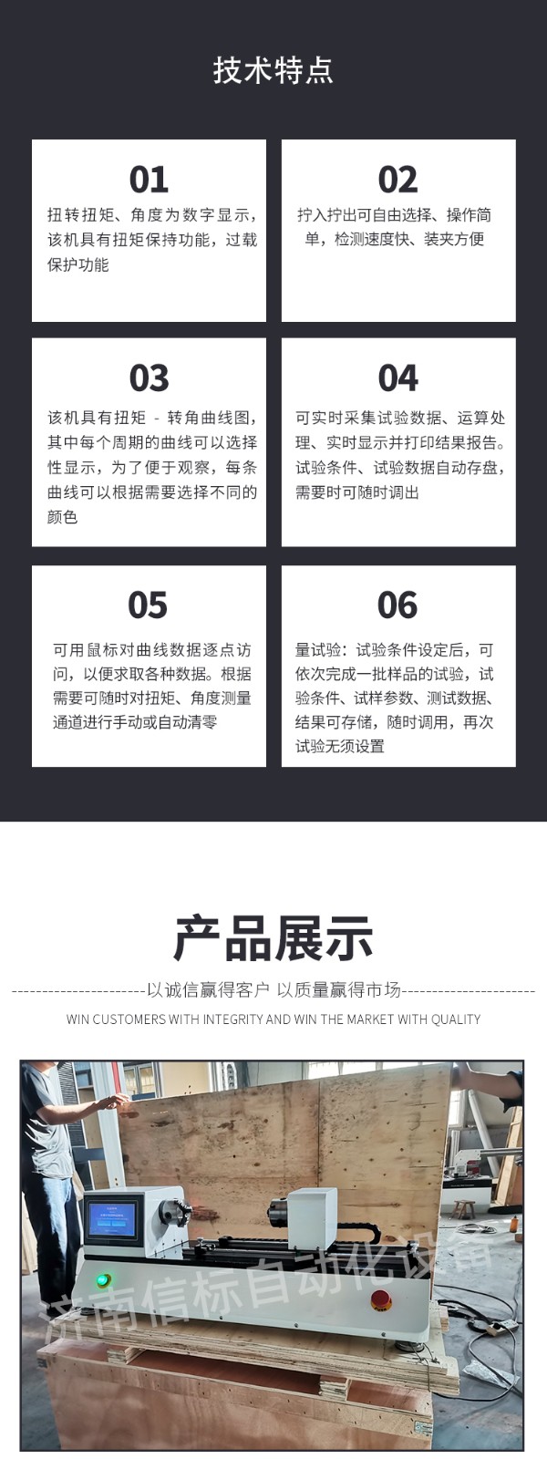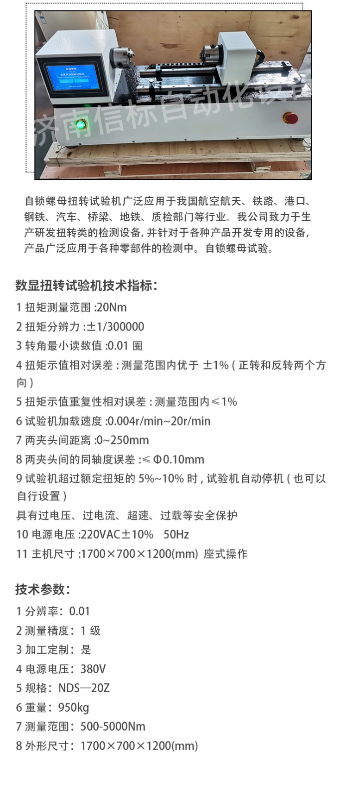 數(shù)顯扭轉(zhuǎn)試驗機(jī)技術(shù)指標(biāo): 1 扭矩測量范圍:20Nm 2 扭矩分辨力:±1/300000 3 轉(zhuǎn)角最小讀數(shù)值:0.01圈 4 扭矩示值相對誤差:測量范圍內(nèi)優(yōu)于±1% (正轉(zhuǎn)和反轉(zhuǎn)兩個方向) 5 扭矩示值重復(fù)性相對誤差:測量范圍內(nèi)≤1% 6 試驗機(jī)加載速度:0.004r/min~20r/min 7 兩夾頭間距離:0~250mm 8 兩夾頭間的同軸度誤差:≤Φ0.10mm 9 試驗機(jī)超過額定扭矩的5%~10%時,試驗機(jī)自動停機(jī)(也可以自行設(shè)置) 具有過電壓、過電流、超速、過載等安全保護(hù) 10 電源電壓:220VAC±10% 50Hz 11 主機(jī)尺寸:1700×700×1200(mm) 座式操作 功能特點(diǎn): 1、適用于WINDOWS平臺的中文試驗軟件,實現(xiàn)試驗數(shù)據(jù)采集處理。 2、可實時采集試驗數(shù)據(jù)、運(yùn)算處理、實時顯示并打印結(jié)果報告。 3、曲線遍歷:可用鼠標(biāo)對曲線數(shù)據(jù)逐點(diǎn)訪問,以便求取各種數(shù)據(jù)。扭矩與扭角關(guān)系曲線中能反映任意點(diǎn)扭矩—角度的關(guān)系,能方便地在曲線上找到所求數(shù)據(jù)點(diǎn);可方便地對曲線局部放大還原等。 4、根據(jù)需要可隨時對扭矩、角度測量通道進(jìn)行手動或自動清零。 5、自動存盤:試驗條件、試驗數(shù)據(jù)自動存盤,需要時可隨時調(diào)出。 6、批量試驗:試驗條件設(shè)定后,可依次完成一批樣品的試驗,試驗條件、試樣參數(shù)、測試數(shù)據(jù)、結(jié)果可存儲,隨時調(diào)用,再次試驗無須設(shè)置。 7、打印試驗報表。
